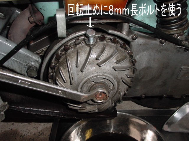★中央の 14mm ナットを外す。トルコンが回転しない様ドレンポートに長めの 8mm ボルトを少しねじ込んで回転をロックする。
