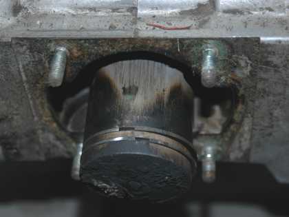 ★ピストンピンの引き抜きは、太めの(+)ドライバーで押して抜く。抜けないときは専用工具を用い、コンロッドに横方向の力が掛からないようにする。★専用工具のアイデアは、「Q and A」を参考にする。