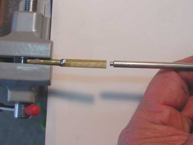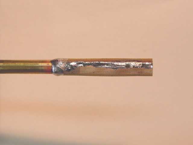 5.半田で付ける ★円筒状のメッシュを新しいパイプに半田付けする。事前にパイプに半田メッキをしておくと着けやすい(画像をクリックすると参考写真が出る)。