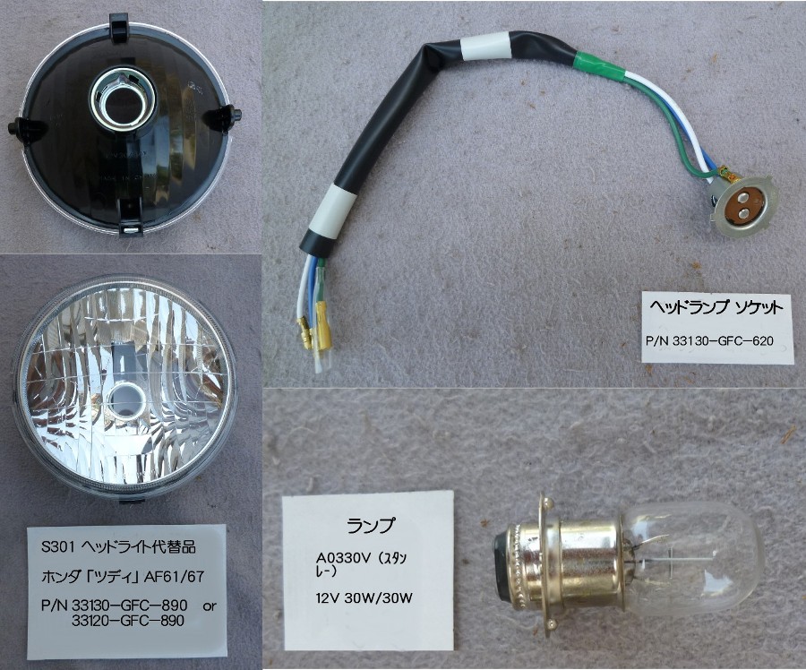★ホンダ「ツディ」(50cc)型式 AF61/67 用部品 ・ヘッドライト P/N 33130-GFC-890 ・ソケット 33130-GFC-620 ・ランプ A0330V 12V 30W/30W ・ネジ、スプリング、金具、ギボシなど