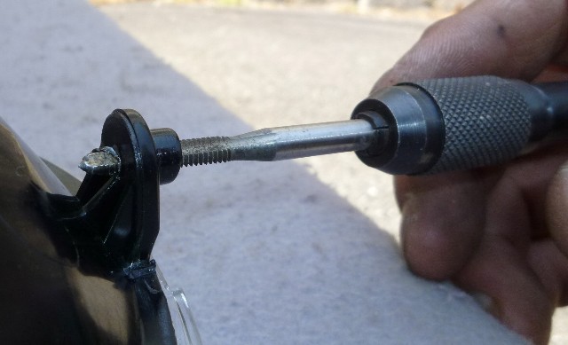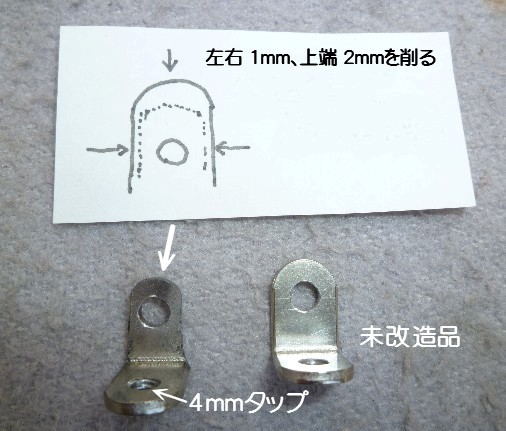 ★両側のリム取付部に 3.2mm のドリルを通す。その後 4mmタップでネジを切る。 ★8mm 薄手ナット(三種)2個を準備しネジ部分に7.2mmのドリルを通す。又は、丸ヤスリで取付部分に入る様に内径を広げる。