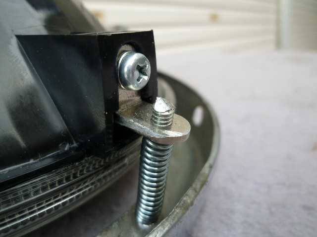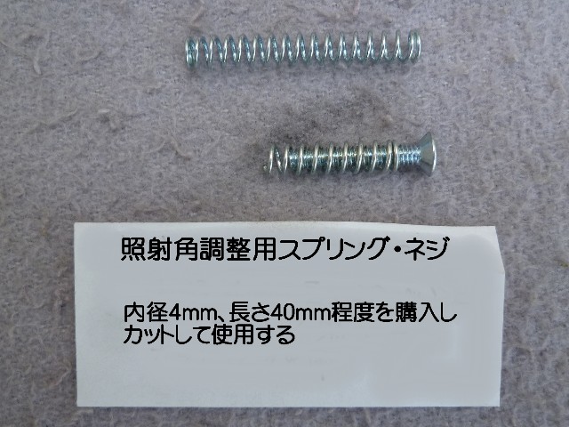 ★ヘッドライトの左右を4mmネジで取り付けるワッシャーの順序はこの様にする。内側のスプリングワッシャー5mmを使う。 ★照射角調整用のスプリング、皿ネジはDIY ショップで購入し加工する。