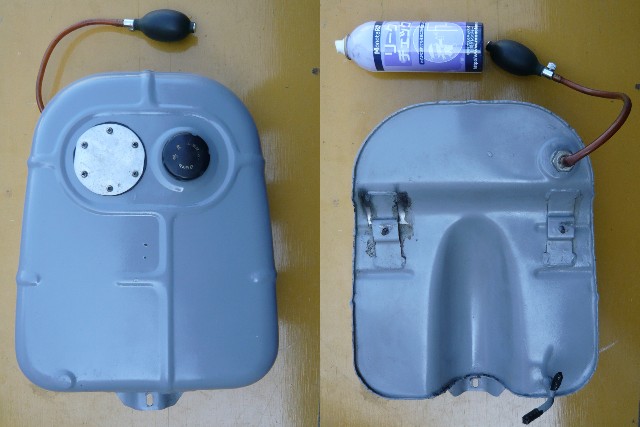 ★漏れのテストにはタンク内を加圧する必要がある。 ★加圧用には血圧計のバルーンを使うと良いが手に入らないときは自転車の空気ポンプなども使える。 ★強く入れるとタンクが変形するので注意すること。 ★コンプレッサーの使用は厳禁 !!