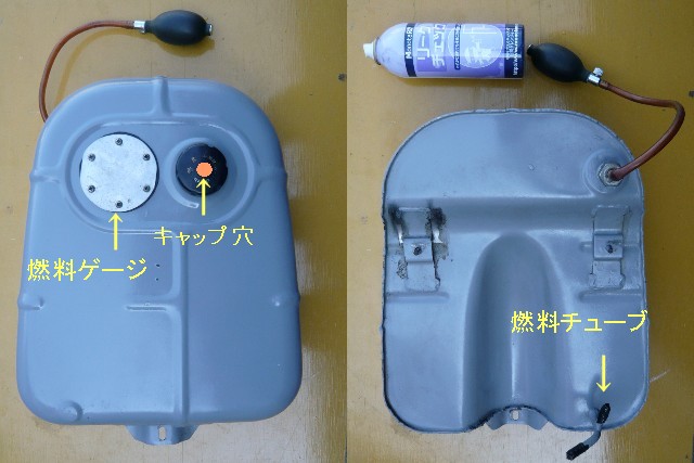 ★燃料ゲージの穴にはアルミ板などを切り抜いて作り、ゴム板のパッキンも入れる。 ★キャブへの「T」型パイプはビニールテープでシールする。