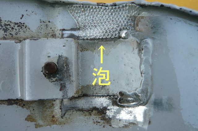 ★タンク内を徐々に加圧しリークチェック剤を塗ると亀裂の部分から泡が出てくる。 ★ほとんどの場合はタンクを車体に取り付けるボルト(スタッド)の溶接部分に原因がある。