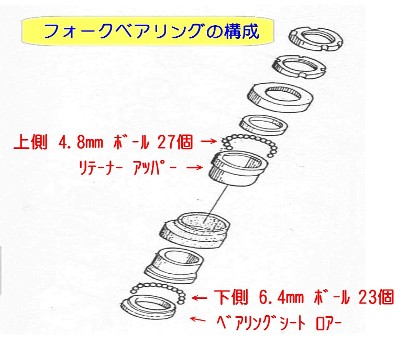 | 1.フォークベアリングの構成 | ★S301 フォークベアリングは上側27個(サイズ3/16)、下側23個(サイズ1/4)のボールがそれぞれのリテーナーに収められている。 ★これらのベアリングがグリース切れになるとハンドルの動きが阻害されて走行の安定性に影響を及ぼす。 |