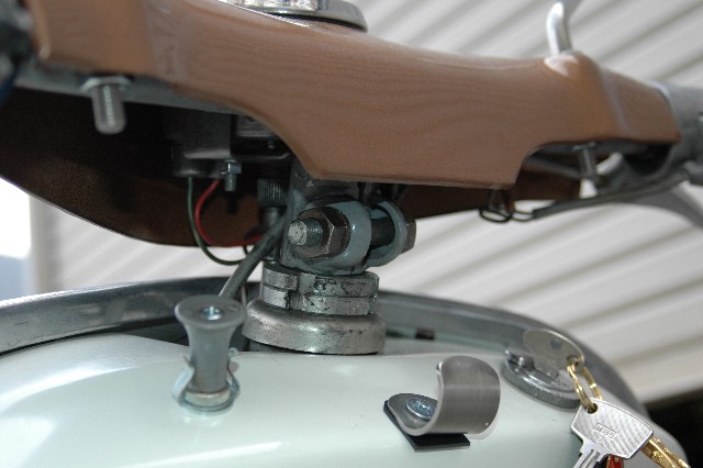| 3.ハンドルの取り外し | ★ミラー、ハンドルカバーを外し、ハンドルのロックボルト10mm)を外す。 ★プラハンマー又はゴムハンマーでハンドルの中央部を下から叩くとハンドルが外れる。 ★メーターケーブル、配線などに損傷を与えない様に必要なコネクションを外しておく。 |