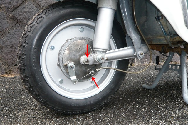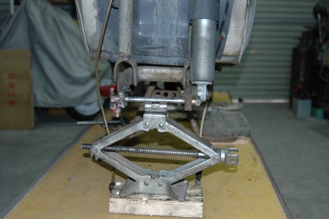 | 2.ホイールの取り外し | ★ホイールについているメーターケーブル、ブレーキケーブルを外す。 ★ホイール両端のナットを緩めて溝に入っているワッシャーを動かしホイールを外す。この時、メインスタンドに板を噛ませて少し持ち上げておくと外しやすい。 ★自動車用のパンタフラフジャッキでフロントリンクを持ち上げるようにする。ホイールシャフトの代わりに長ボルトを入れておくとジャッキが噛みやすい。写真 |