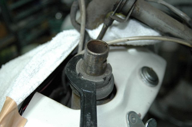 | 12.ナットの取付 | ★ベアリングシートを入れてナットを締め付ける。この時リテーナーカバーは取り付けない。 ★ナットがキッチリ締まるとジャッキを外してフォークがなめらかに動くことを確かめる。ナットの締付トルクによりなめらかさが変わる時はボールが正規に入っていないのでフォークを外してやり直す。 ★もう一度ジャッキを当ててナットを取り外し、今度はリテーナーカバーを取り付けて正規にナットを締め付ける。(写真) |