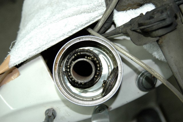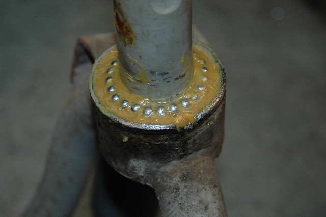 | 6.下側ベアリングの取り外し | ★下側ボールは上側より少し大きいものが23個付いている。 ★ボールが飛散する確率は上側よりも大きいため充分注意し遠くまで転がっていかない様に大きなウエスなどを敷いておく。 ★フォークを持ち上げているジャッキをゆっくり下げる。 ★ボールが見えるところまで来たらとれるボールは取っておく。 |