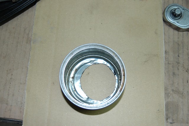 | 5.上側ベアリングの取り外し | ★上側ボールは27個入っている。注意しないとボールが落下し紛失してしまう。缶詰の空き缶の中央部に穴を開けて(写真)リテーナーにはめ込みボールが外側にこぼれないようにすると良い。 ★取り外したボールは数を確かめておくこと。 |