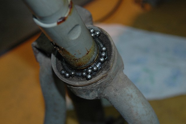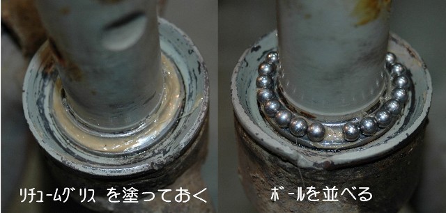 | 7.フォークの取り外し | ★フォークを抜くときは車体をもう少し持ち上げるかフォークを180°廻して後ろ向きにするとうまく外れる。 ★残ったボールを取り外す。 上下のボールは灯油などで洗って傷のないことを確かめておく。 |