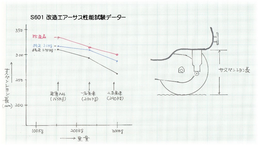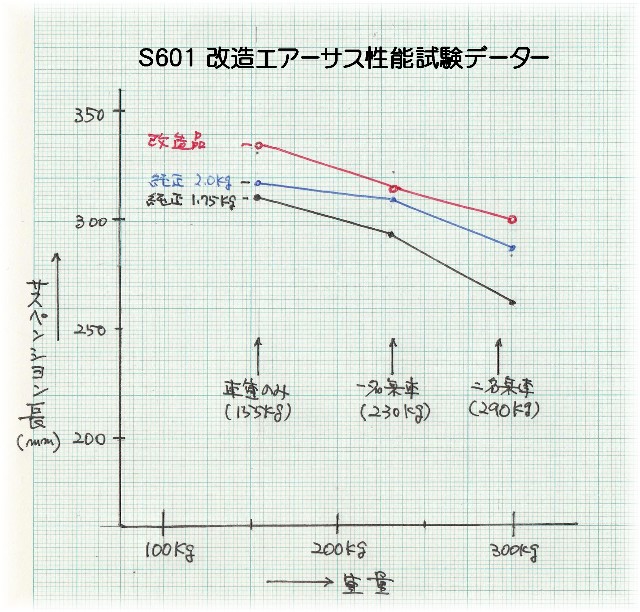 ★純正エアーサスとの比較は図の通りで荷重に対する沈みは少し固めだが過重カーブはほぼ同等で結果は満足できる。 ★★ 困った時は試して あれ。