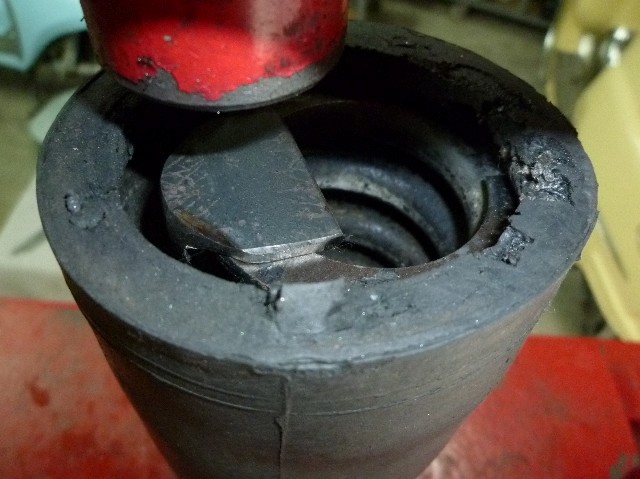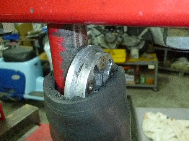 ★ダイヤフラムの中に5穴ブラケットを入れるがこの作業は大変難しい。 ★油圧プレスを使ってもこのままではダイヤフラムが凹んで入らない。 |