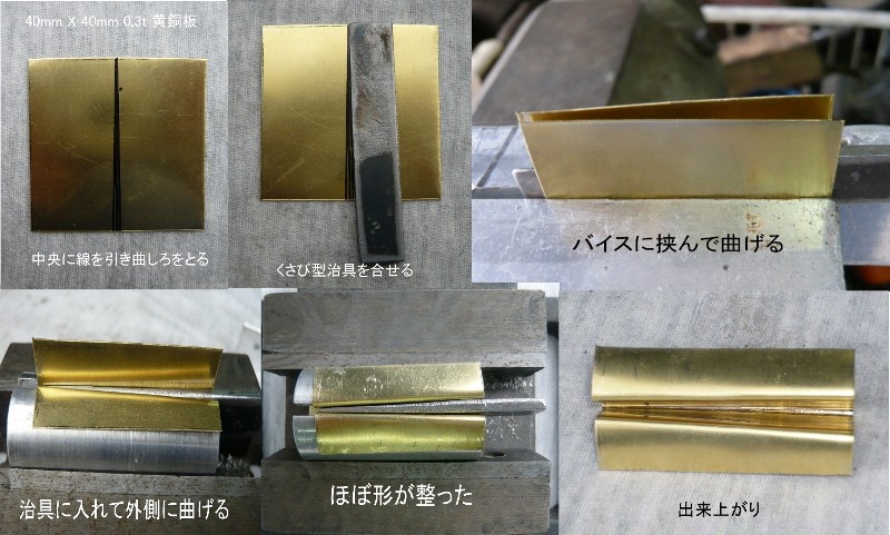 5.V 型板の製作 ★0.3 mm 厚、大きさ 40 X 40 mm の黄銅板を切り抜く。3項で作った 天、地、円盤と同じ材料。