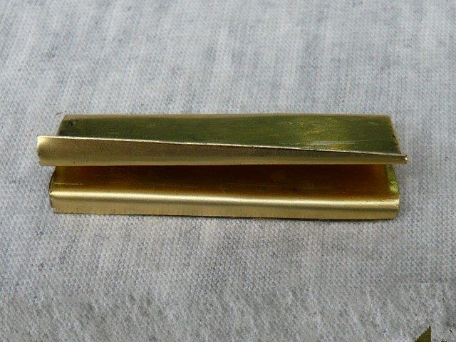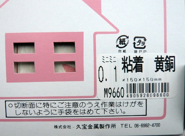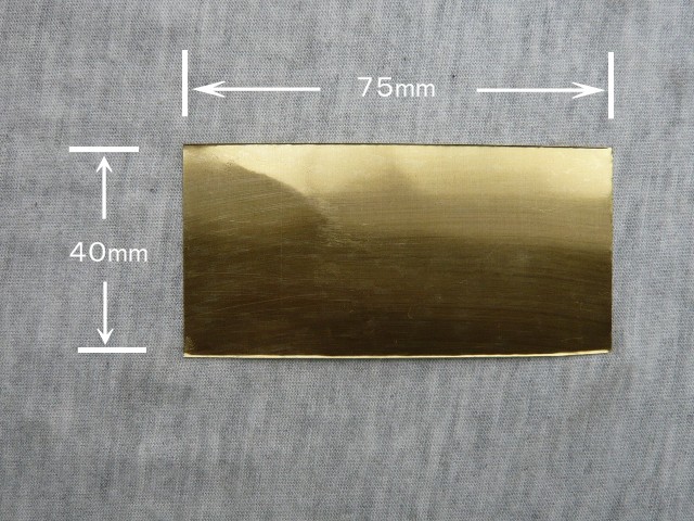4.外板の切り取り ★0.1 mm 厚の黄銅板を 40 X 75 mm に切る。裏に粘着剤のついてないものがいいが、入手できなかったので粘着剤付(久宝金属製作所 品番 9660)を購入しシンナーで取り除いた。
