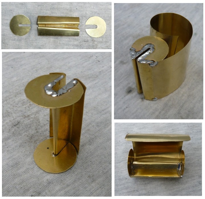 ★外板は前もってカール状に巻いておき写真を参考に、片方をまず半田付けし全周に巻く様にして天板の周辺を付けていく。