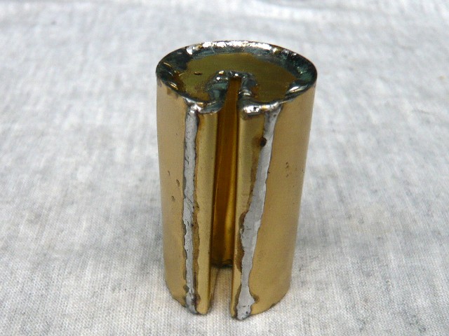 2.フロートはこんなもの ★直径22mm、長さ38mmの黄銅の薄板を半田付けしたもので中央にV型の切り込みがある。 ★見た目は綺麗で製作も簡単に見えるがいくつかの失敗作もある。