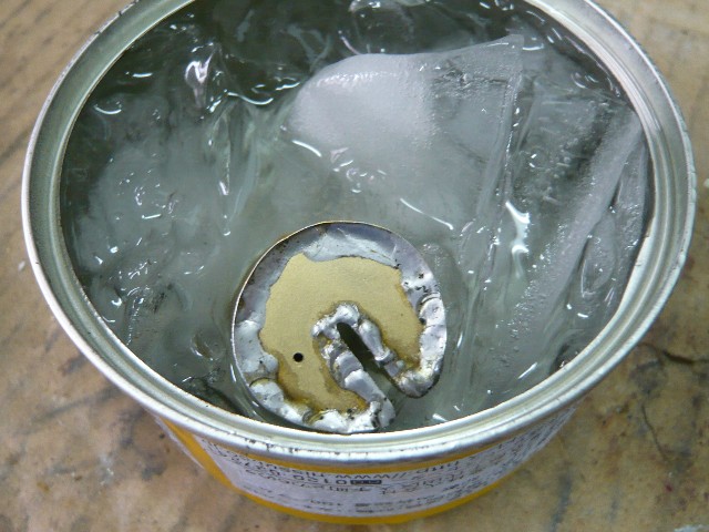 ★半田の熱でフロート内部の空気の膨張を防ぐため、中央の空気穴を上にしてこの冷水につける。穴から水が入らない程度にする。