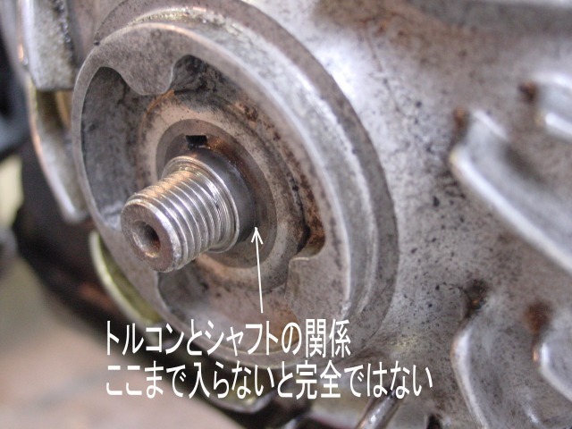 ★フリーホイールとスプロケット側の切欠きを4項で記録した位置にセットする。 ★トルコンAssyをゆっくりシャフトに差し込んでいく。