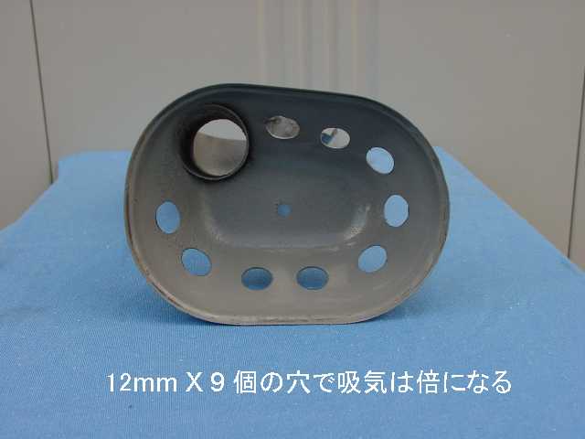 ★エアーフィルターケースに12mmの穴を9個開けて現在の開口面積の2倍にしてやると我慢の出来る吸気騒音で2速の最高速が70Km/hは確保できた。