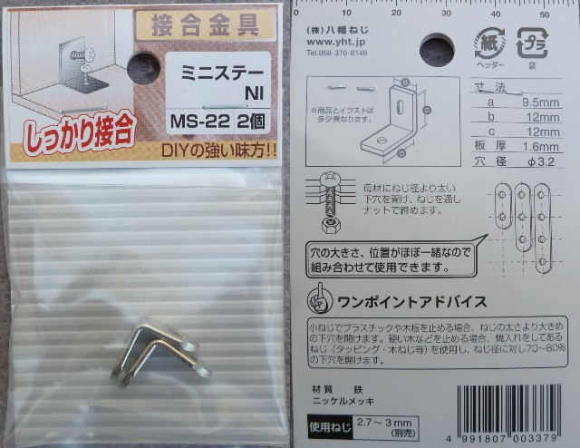 ★照射角調整に「L]型金具が必要で自分で作ることも出来るが DIY ショップでは「ミニステー」と称する金具を売っているところがある。 ★少し加工が必要だがヤスリとやる気があればすぐに出来る。削るのは1辺だけでもう1辺の穴は4mmタップでネジを切る。