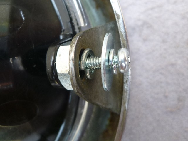 ★ヘッドライトの左右を4mmネジで取り付けるワッシャーの順序はこの様にする。内側のスプリングワッシャー5mmを使う。 ★照射角調整用のスプリング、皿ネジはDIY ショップで購入し加工する。
