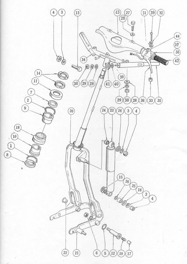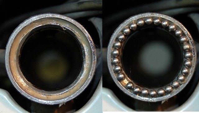 | 1.フォークベアリングの構成 | ★S301 フォークベアリングは上側27個(サイズ3/16)、下側23個(サイズ1/4)のボールがそれぞれのリテーナーに収められている。 ★これらのベアリングがグリース切れになるとハンドルの動きが阻害されて走行の安定性に影響を及ぼす。 |
