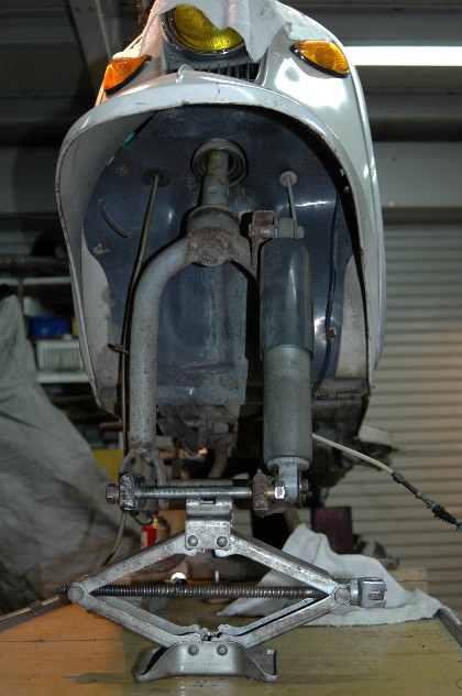 | 2.ホイールの取り外し | ★ホイールについているメーターケーブル、ブレーキケーブルを外す。 ★ホイール両端のナットを緩めて溝に入っているワッシャーを動かしホイールを外す。この時、メインスタンドに板を噛ませて少し持ち上げておくと外しやすい。 ★自動車用のパンタフラフジャッキでフロントリンクを持ち上げるようにする。ホイールシャフトの代わりに長ボルトを入れておくとジャッキが噛みやすい。写真 |