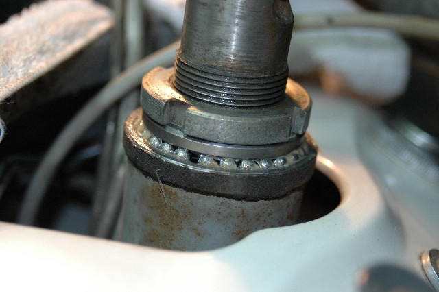 | 6.下側ベアリングの取り外し | ★下側ボールは上側より少し大きいものが23個付いている。 ★ボールが飛散する確率は上側よりも大きいため充分注意し遠くまで転がっていかない様に大きなウエスなどを敷いておく。 ★フォークを持ち上げているジャッキをゆっくり下げる。 ★ボールが見えるところまで来たらとれるボールは取っておく。 |