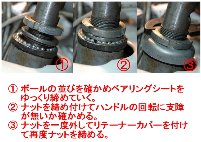 | 12.ナットの取付 | ★ベアリングシートを入れてナットを締め付ける。この時リテーナーカバーは取り付けない。 ★ナットがキッチリ締まるとジャッキを外してフォークがなめらかに動くことを確かめる。ナットの締付トルクによりなめらかさが変わる時はボールが正規に入っていないのでフォークを外してやり直す。 ★もう一度ジャッキを当ててナットを取り外し、今度はリテーナーカバーを取り付けて正規にナットを締め付ける。(写真) |