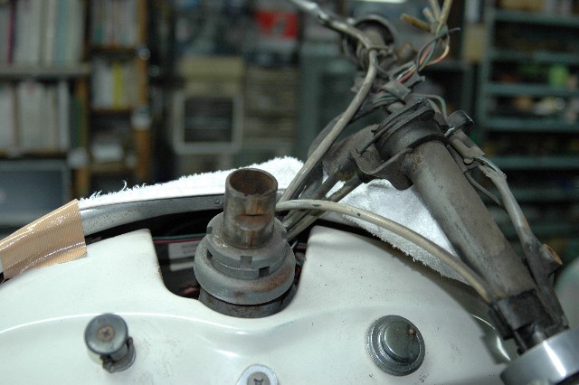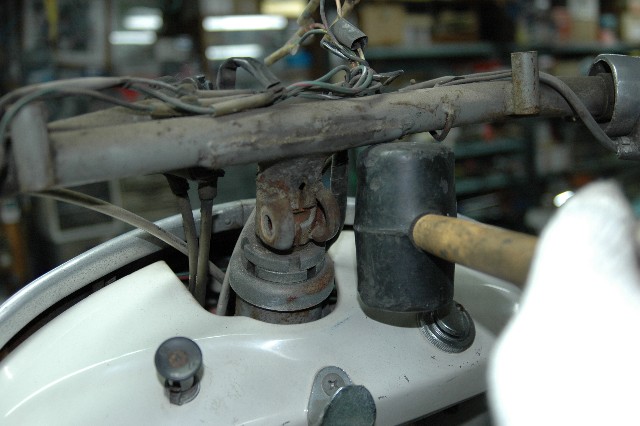 | 3.ハンドルの取り外し | ★ミラー、ハンドルカバーを外し、ハンドルのロックボルト10mm)を外す。 ★プラハンマー又はゴムハンマーでハンドルの中央部を下から叩くとハンドルが外れる。 ★メーターケーブル、配線などに損傷を与えない様に必要なコネクションを外しておく。 |
