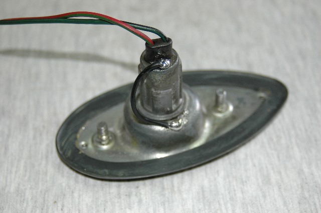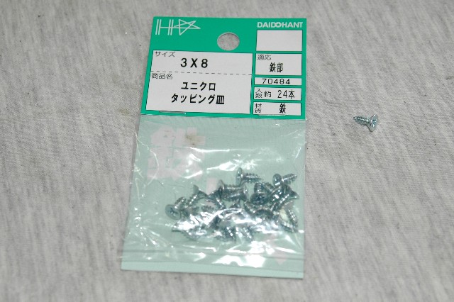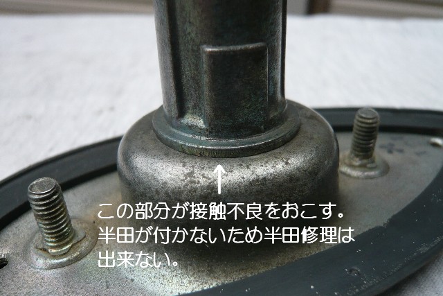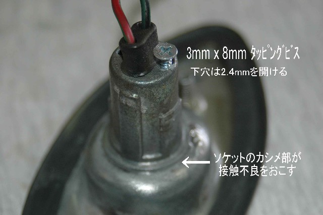 | 3.指示器の修理 | ★指示器のソケット部のカシメが緩んでアースが不完全になっていることがこの原因であるがこの部分の半田付け修理は出来ないため以下の方法を取る。 ★ホームセンターで 3 X 8 mm のタッピングビスを買ってくる。 ★指示器を取り外し写真の位置に 2.4mm の穴をドリルで開け、タッピング ビスをねじ込む |