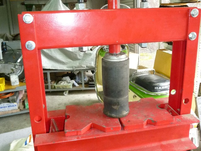 ★ダイヤフラムの中に5穴ブラケットを入れるがこの作業は大変難しい。 ★油圧プレスを使ってもこのままではダイヤフラムが凹んで入らない。 |