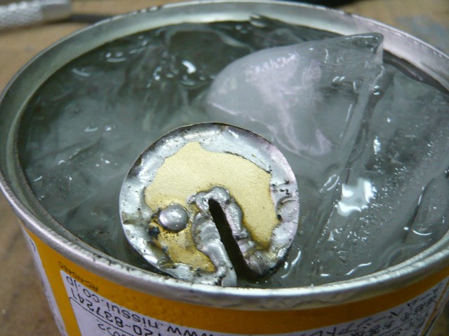 ★半田の熱でフロート内部の空気の膨張を防ぐため、中央の空気穴を上にしてこの冷水につける。穴から水が入らない程度にする。